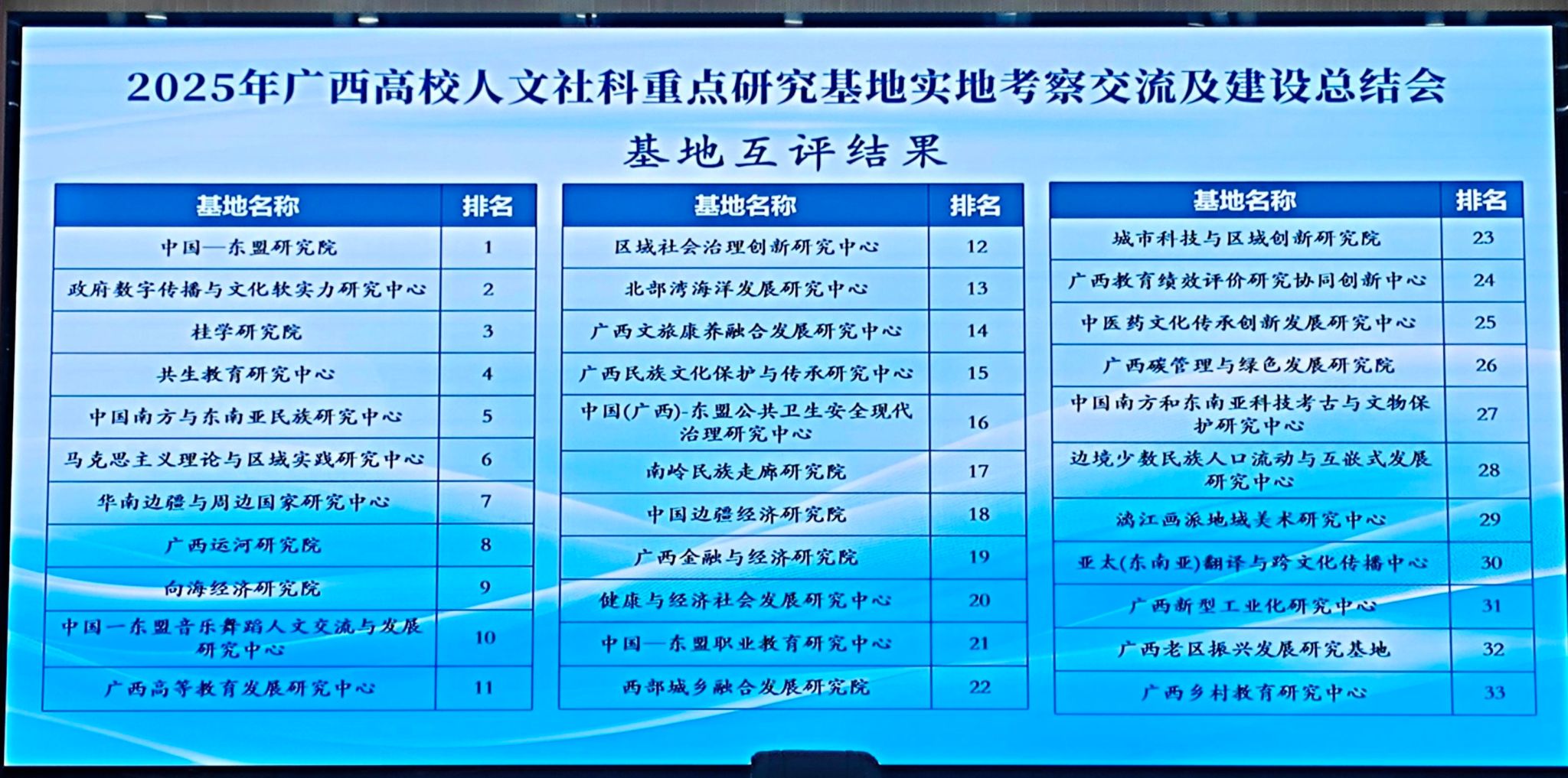 在2025年度总结与基地互评环节中,南岭民族走廊研究院在全区33个重点研究基地考核中取得了第17名的较好成绩。同时,由基地主任刘永红等主编的《南岭文书》(第四辑:31-40卷)荣获2025年度广西高校人文社科重点研究基地智库研究优秀成果奖一等奖。